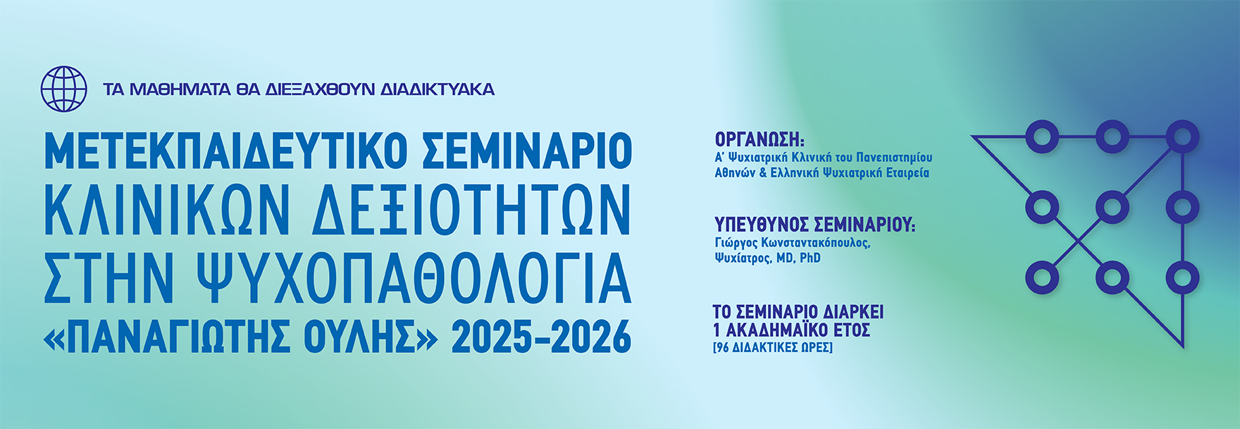 Το σεμινάριο θα διεξαχθεί διαδικτυακά με μαθήματα μέσω βιντεοδιάσκεψης και με e-learning από την ιστοσελίδα του Psychopathology.gr.